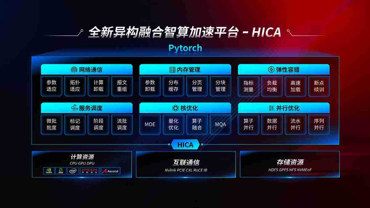 通过自研的服务层、、、、中间适配层、、、、以及调度编排算法,,,采用数据并行、、模型并行等多种并行方式,,把并行计算任务进行有效的分解,,,,使其分别由相应的软件栈和算力资源来承接。。。。当GPU资源变化,,,HICA可以实时动态调度计算子任务并调整模型拓扑和架构,,以充分聚合各种算力资源。。。